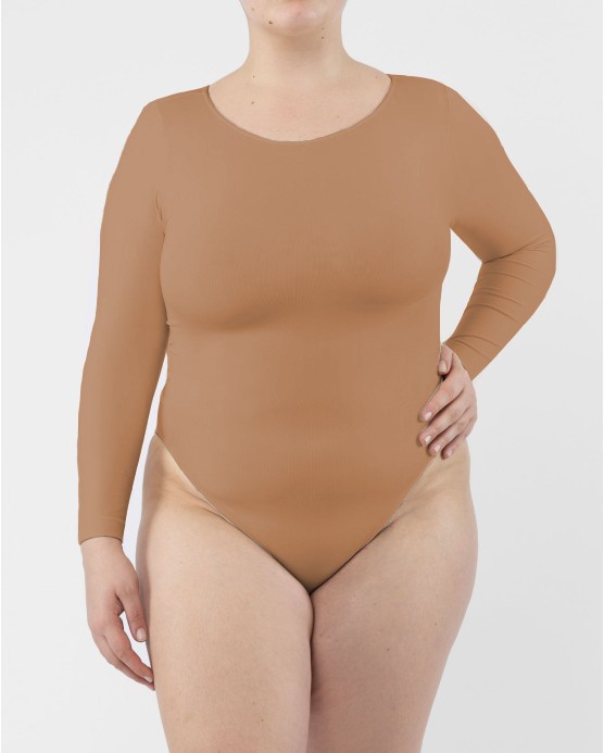 Long-sleeved bodysuit with boat neckline and shaping at the hips to define the waist. Cotton gusset closure with three size hooks.